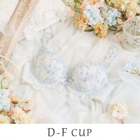 優雅なアンティークの壁紙を思わせる、繊細で上品なシリーズです。淡い色彩で彩られたお花の中にきらめくラメ糸を散りばめて、印象的な輝きを演出しました。ストラップにはお揃いのアップリケをほどこして、スカラップから繋がる1つのお花のリースのような、華やかなデザインに。リボン中央にもポイントでお花のアップリケを重ねて、思わず心ときめく特別感をプラスします。アンダー部分にはギャザーを寄せたレースをあしらうことで、ふんわりと優しい印象に仕上がりました。フラワーガーデンを訪れたような、お花にそっと包み込まれる可憐なコレクションです。