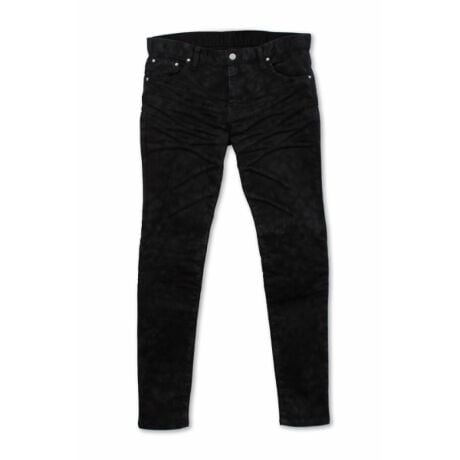 ブラックデニムに黒吹き付けを全面ムラ状に施すことで、光を吸い込むような深みと、仄かに浮かび上がるレオパード柄が、月明かりの下に佇む豹のような、静かで力強い存在感を演出します。