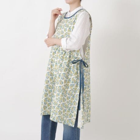 首元と腰ひもの無地生地がアクセントになており、ギフトにぴったりの華やかなエプロンです。