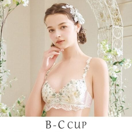 優雅なアンティークの壁紙を思わせる、繊細で上品なシリーズです。淡い色彩で彩られたお花の中にきらめくラメ糸を散りばめて、印象的な輝きを演出しました。ストラップにはお揃いのアップリケをほどこして、スカラップから繋がる1つのお花のリースのような、華やかなデザインに。リボン中央にもポイントでお花のアップリケを重ねて、思わず心ときめく特別感をプラスします。アンダー部分にはギャザーを寄せたレースをあしらうことで、ふんわりと優しい印象に仕上がりました。フラワーガーデンを訪れたような、お花にそっと包み込まれる可憐なコレクションです。