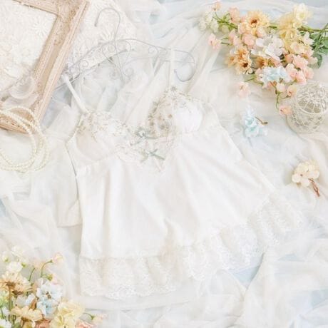 優雅なアンティークの壁紙を思わせる、繊細で上品なシリーズです。淡い色彩で彩られたお花の中にきらめくラメ糸を散りばめて、印象的な輝きを演出しました。身生地には前後でV字にカッティングしたレースをあしらい、さりげない透け感をプラス。裾にもお揃いのストレッチレースをほどこして、ふんわりと優しい印象に仕上がりました。フロントとバックスタイルにはリボンを添えて、ポイントでお花のアップリケを重ねることで、思わず心ときめく特別な印象に。フラワーガーデンを訪れたような、お花にそっと包み込まれる可憐なコレクションです。