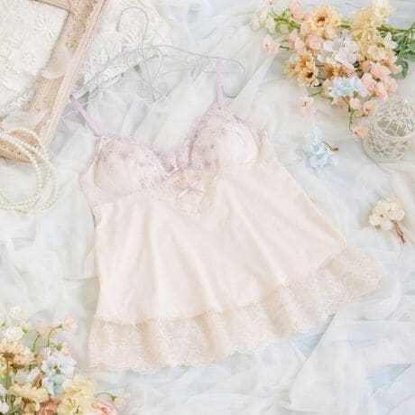 優雅なアンティークの壁紙を思わせる、繊細で上品なシリーズです。淡い色彩で彩られたお花の中にきらめくラメ糸を散りばめて、印象的な輝きを演出しました。身生地には前後でV字にカッティングしたレースをあしらい、さりげない透け感をプラス。裾にもお揃いのストレッチレースをほどこして、ふんわりと優しい印象に仕上がりました。フロントとバックスタイルにはリボンを添えて、ポイントでお花のアップリケを重ねることで、思わず心ときめく特別な印象に。フラワーガーデンを訪れたような、お花にそっと包み込まれる可憐なコレクションです。