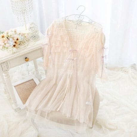 優雅なアンティークの壁紙を思わせる、繊細で上品なシリーズです。身生地全体にふんだんにチュールをあしらうことで、華やかさを演出しました。袖にはカッティングを入れて、抜け感を生み出し優雅なシルエットに。さらにシャーリング仕様をほどこして、ふんわりと立体感のある繊細な印象に仕上がりました。フロント部分と袖には結べるタイプのサテンリボンをプラス。裾にはラウンドカットをほどこしました。ワンカラーのデザインのため、他シリーズとも組み合わせてコーディネートをお楽しみいただけます。フラワーガーデンを訪れたような、お花にそっと包み込まれる可憐なコレクションです。