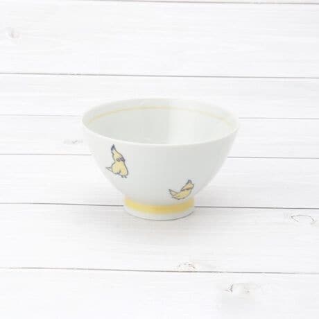 ころっとしたユニークで魅力的な表情の鳥たちが一周描かれたお子様か大人までお使いいただけるサイズの可愛らしい飯碗です。