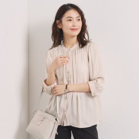 とろみ感と軽さが特徴の薄手サテン素材でギャザーを寄せたふんわり柔らかなシルエットがポイント。