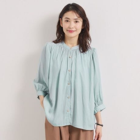 とろみ感と軽さが特徴の薄手サテン素材でギャザーを寄せたふんわり柔らかなシルエットがポイント。