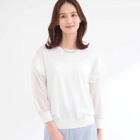 袖にあしらったレースと、ラウンドネック、ネックと前後2WAYで着用いただける華やかなニットトップス。