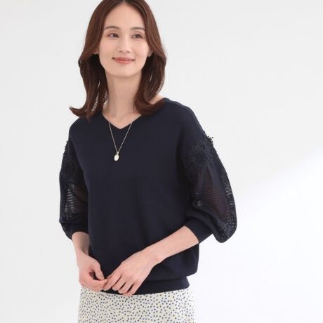 袖にあしらったレースと、ラウンドネック、ネックと前後2WAYで着用いただける華やかなニットトップス。