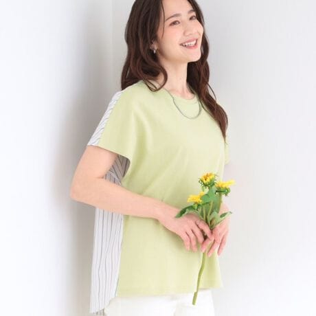フロントはシンプルなクルーネックで、バックスタイルにシャツ地がアクセントになっています。