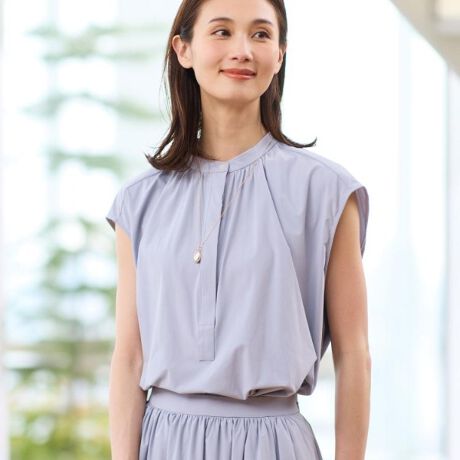 衿元のギャザーが柔らかなドレープを描く、上品な印象のプルオーバーブラウス。