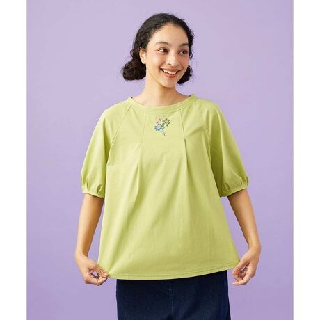 ワンポイントプリントが目を惹くTシャツ。テーマの「ドン・キホーテ」からインスピレーションを受けています。前に入ったタックとラグランスリーブで快適な着心地を実現。前後着用可能でボタンの面を前にしてもお召しいただけます。丸みのある袖がカジュアルすぎない女性らしい印象に。発泡プリントで刺繍のような花モチーフを襟下とスリット部分に施しドン・キホーテの世界観を表現しました。ホコモモラのこだわりが詰まった今季イチオシのオススメアイテムです。