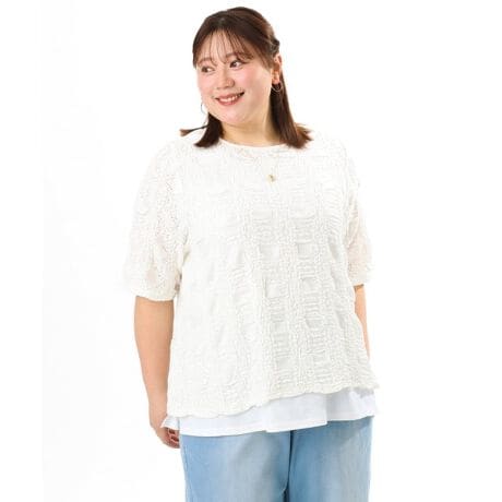凹凸感のあるレースが印象的な、大人可愛い雰囲気と着心地を兼ね備えたレーストップス。