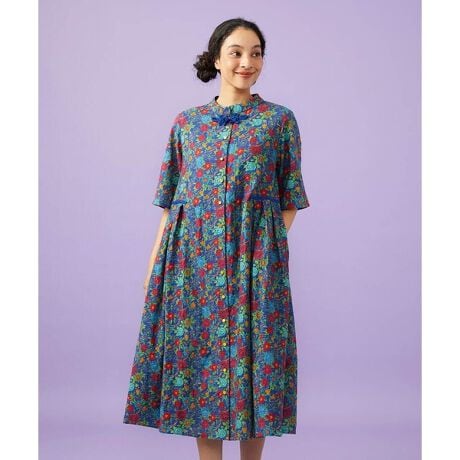 お花のプリントが華やかなワンピース。テーマの「ドン・キホーテ」からインスピレーションを受けています。ゆったりシルエットでリラクシーな着用感です。総刺繍による表面感とプリントの色彩感の組み合わせがポイント。首元に付けた組紐の飾りボタン、ウエスト切替の配色ブレードが華やかな印象を後押しします。前開きで羽織としての着用も◎上品で華やかなワンピースは今季イチオシのオススメアイテムです。