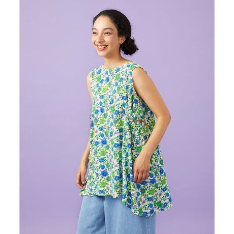 お花のプリントが華やかなノースリーブブラウス。テーマの「ドン・キホーテ」からインスピレーションを受けています。総刺繍による表面感とプリントの色彩感の組み合わせがポイントです。脇に通した配色紐でシルエットの調節が可能なフレアシルエット◎上品で華やかなブラウスは今季イチオシのオススメアイテムです。