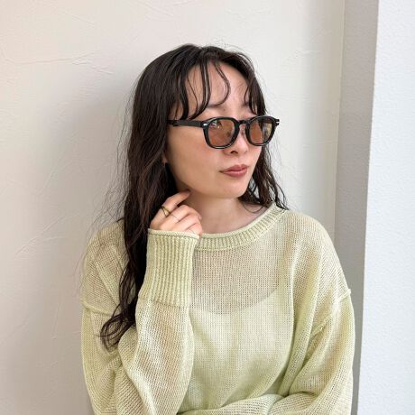 ・ブラックのセルフレームが顔まわりを引き締め、シャープな印象に