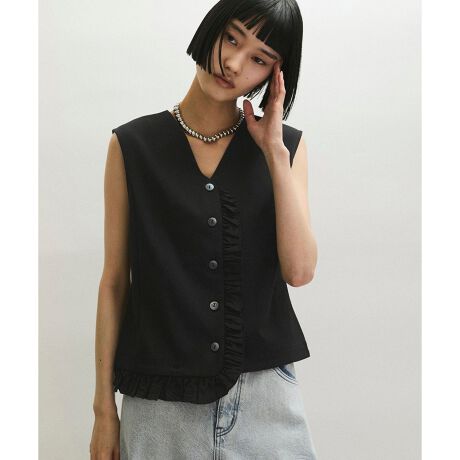 シアー素材を使用したフロントのフリルが魅力なスリーブレストップス。