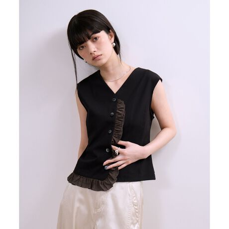 シアー素材を使用したフロントのフリルが魅力なスリーブレストップス。