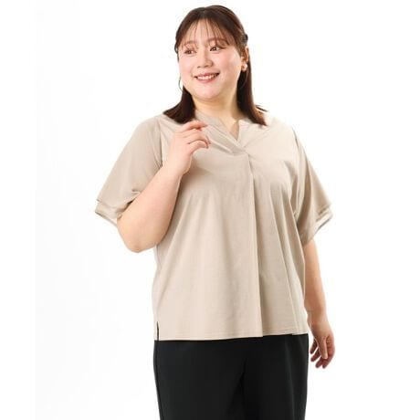 襟ぐりはスリットネックデザインで、胸元をすっきりと見せつつ抜け感をプラス。