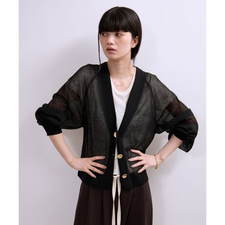 絶妙なカーブラインが魅力なメタルボタンを使用したシアーカーディガン。