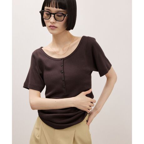 やや深めに開いたヘンリーネックリブTシャツ。