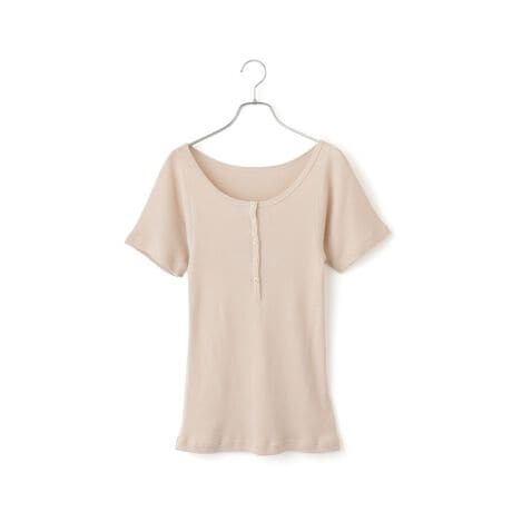 やや深めに開いたヘンリーネックリブTシャツ。