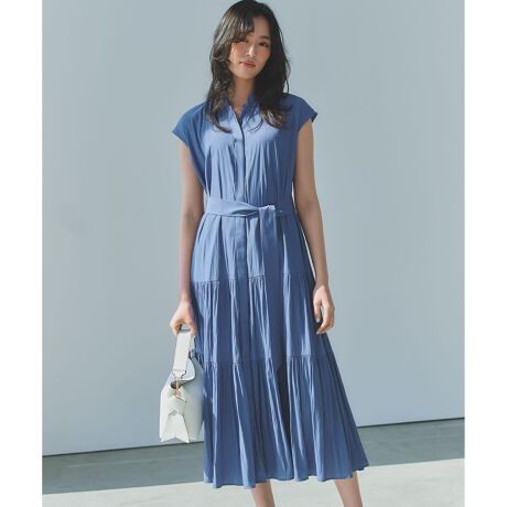 ■デザイン・ほどよくリラクシーなフレアシルエットの前ボタンワンピース。・襟元はすっきりと、裾にかけて計算されたティアードデザインがほどよく女性らしい華やかな印象を演出します。・付属の共布ベルトでウエストマークすれば、きれいめフィット&フレアシルエットもお楽しみいただけます。・フロントは比翼仕立てで貝ボタンをあしらい、さりげなく品の良さをプラスしています。・ペチコートがついているため、暑い季節にも軽やかな着心地です。・ジャケットやカーディガンを羽織っても、素材がやわらかに馴染むため、もたつかずノンストレスな着心地です。