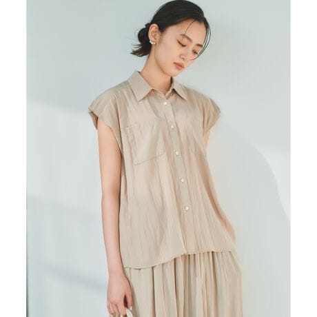 ■デザイン・上品さと機能性を兼ね備えたノースリーブシャツブラウス。・柔らかく落ち感のある素材で、袖口のブラウジングがほどよく自然なドレープを描き、さりげなく気になる二の腕をカバーしてすっきりとした印象に見せてくれます。・シャツ襟と胸元のアウトポケットが甘くなりすぎないアクセントに。・前開きで着脱がイージーなのも魅力。・裾がほんのりシャツテールデザインで両サイドにスリットが入っているため、ボトムを選ばず、裾をアウトにしてもバランスよく決まります。・同素材のギャザーパンツ(品番:PRWXLM0310)とセットアップで合わせるスタイルもおすすめです。・ジャケットやカーディガンを羽織っても、素材がやわらかに馴染むため、もたつかずノンストレスな着心地です。