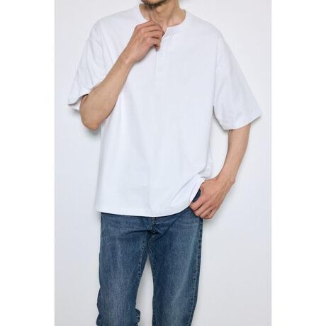 ■ヘンリーネックハングTEE■ポイントヘンリーネックの前立てがアクセントになる、ワーク感のあるハングTEE。ざっくりとしたドライな表情と程よい厚みが、男らしい無骨な雰囲気を演出します。着込むほどに風合いが増し、長く愛用できる一枚です。WHT・BLKのベーシックカラーで、幅広いスタイリングに取り入れやすいのもポイントです。■ディテールコットン100%のしっかりとした厚手生地を使用した、タフな作りが魅力。表面は粗めのテクスチャーで、着込むほどに柔らかく体に馴染んでいく特性があります。ヘンリーネックのボタン仕様は、開閉によって首元の表情に変化をつけられます。袖口・裾は耐久性を考慮した縫製で、デイリーに使いやすい仕様に仕上げています。S/M/Lの3サイズ展開。■スタイリング【カジュアル】デニムやチノパンツと合わせて無骨で男らしい日常スタイルに。【レイヤード】シャツやミリタリージャケットのインナーとして合わせ、首元のボタンを見せることでアクセントになります。【今っぽく】スラックス+スニーカーでラフに外すと程よく洗練された印象になります。■生地ドライでざっくりとした質感とがっしりした厚みのタフさが特徴の生地です。着込むほどにさらに柔らかく肌になじみ、味わい深い古着のような風合いが出てきます。 透け感:なし裏 地:なし伸縮性:なし光沢感:なし[注意事項]※画像の商品はサンプルです。実際の商品と仕様、加工が若干異なる場合があります。※画像の商品は光の照射や角度、お使いのモニター環境により、実物と色味が異なる場合がございます。※着用、お取り扱いの際は、アテンションタグをご確認ください。
