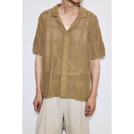 ■スクエアパターンニットメッシュシャツ■ポイントスクエアパターンの透かし柄が特徴のニットメッシュシャツです。■ディテール太番手コットンの柔らかさとパッチワーク風の柄がリズミカルで上品な抜け感を作り、夏のこなれた着こなしに最適。程よい透け感と伸縮性があり、肌離れが良く快適な着心地も魅力です。O/WHT・BLK・BEGの3色展開。■スタイリングインナーにタンクトップや薄手のTシャツを合わせ、透け感を活かしたレイヤードスタイルがおすすめです。ショーツやクロップドパンツでリゾート風に、細身デニムで都会的カジュアルにも。サンダルやローファーで仕上げると◎。■生地10/2の太番手コットン糸を使用した、ミドルゲージの透かし柄ニット素材です。スクエア柄をパッチワーク風に組み合わせた編み地で、ニットならではの柔らかさと軽やかな表情が特徴です。透け感:あり裏 地:なし伸縮性:あり光沢感:なし[注意事項]※画像の商品はサンプルです。実際の商品と仕様、加工が若干異なる場合があります。※画像の商品は光の照射や角度、お使いのモニター環境により、実物と色味が異なる場合がございます。※着用、お取り扱いの際は、アテンションタグをご確認ください。