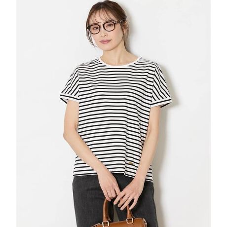 程よくゆとりのある身幅と長めのフレンチスリーブで、リラックス感のある着こなしが楽しめるデザイン。気になる二の腕や体形をさりげなくカバーしながら、すっきりとした印象に仕上げました。袖口のボーダーラインの切り替えとロゴ入りメタルパーツがアクセントとなり、シンプルながらも1枚でサマになるアイテムです。