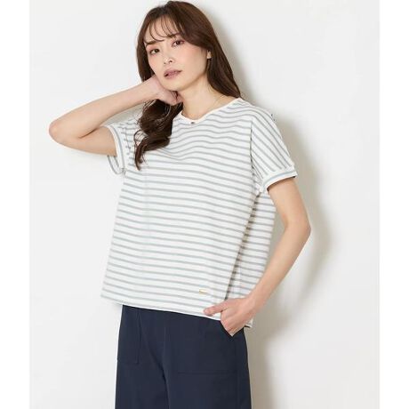 さらりとした肌触りのコットン天竺素材を使用したボーダーカットソー。接触冷感機能を備え、暑い季節も快適な着心地を叶えます。程よくゆとりのあるシルエットと長めのフレンチスリーブで、気になる二の腕や体形を自然にカバー。シンプルながらも、袖口のボーダー切り替えとロゴ入りメタルパーツがさりげないアクセントになり、1枚で着映える大人のデイリートップスです。ベーシックで汎用性のあるホワイト×ブラック、やわらかな雰囲気が魅力のホワイト×グリーンの2色展開。
