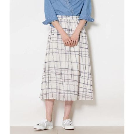 ニューヨーカータータンのカラーを活かした、オリジナルチェック柄のギャザースカート。手書き風のランダムな線が柔らかな表情を生み、チェック柄でも軽やかで女性らしい印象に仕上げています。ふんわりと揺れるシルエットがコーディネートに華やぎを添え、シンプルなトップスと合わせるだけで洗練されたスタイルに。同素材ブラウス(品番:51648252)と合わせればワンピースのような着こなしも楽しめる、着回し力の高い一着です。クリーンで爽やかなアイボリー、知的な雰囲気が魅力のネイビーの2色展開。