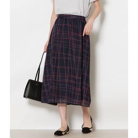 ニューヨーカータータンのカラーを活かした、オリジナルチェック柄のギャザースカート。手書き風のランダムな線が柔らかな表情を生み、チェック柄でも軽やかで女性らしい印象に仕上げています。ふんわりと揺れるシルエットがコーディネートに華やぎを添え、シンプルなトップスと合わせるだけで洗練されたスタイルに。同素材ブラウス(品番:51648252)と合わせればワンピースのような着こなしも楽しめる、着回し力の高い一着です。クリーンで爽やかなアイボリー、知的な雰囲気が魅力のネイビーの2色展開。