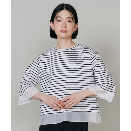 ■デザイン袖口と裾に施されたオーガンジーのシアー素材が軽やかで清涼感のある印象を演出。後ろ身頃に少しだけボリュームを出すパターンテクニックにより、サイド、バックからの見え方にも立体感を作り、シンプルなシルエットながらデザイン性のある、一枚で華やかさをプラスしてくれるアイテムです。■素材高級(超長)綿のスーピマコットンを(32Gの)ハイゲージで編みあげたポンチ素材。高密度で編むことにより今までにないシャープさとハリ感を表現しています。また、特別な加工(ロイヤルクール加工)を施す事で、糸の毛羽をそぎ落とし生地表面の上品な光沢をプラスしました。綿100%でありながら合繊の様な程良いドレープ性を持つ素材です。また、淡色でも透けにくい素材感や高いストレッチ性で快適な着心地を叶えます。・水洗い可■サンプル撮影商品画像の商品はサンプルです。実際の商品とはサイズや色味、素材、デザイン等の仕様が若干変更になる場合がございます。■照明の関係により、実際の製品とは色味が違って見える場合があります。またパソコン・スマートフォンなどの環境により、若干製品と画像のカラーが異なる場合もございます。■サイズ表記はあくまで目安となります。
