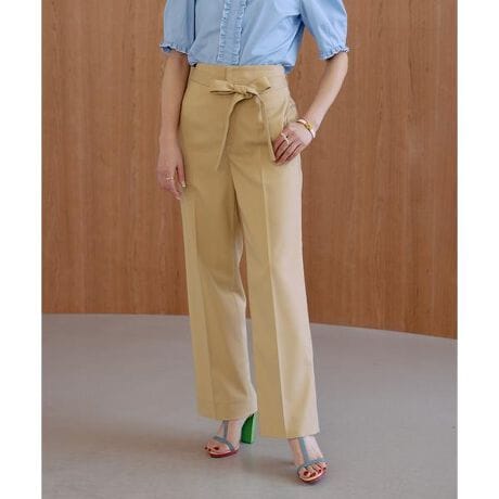 ■デザイン脚のラインをまっすぐ美しく見せる、ハイウエストのストレートパンツ。フロントは無駄をそぎ落としたすっきりとしたデザインで、甘さを抑えたシャープな印象に。後ろのみに配したベルトループは、リボンサッシュベルトを通せる仕様で、後ろ姿にニュアンスを添えます。リボンを付けず、ミニマルに着こなすスタイルもおすすめです。バックスタイルには、飾りポケット口の下にフラワーレースをあしらい、さりげなく華やかなアクセントをプラス。ベージュにはホワイト、ブラックには同色のレースを配し、カラーごとに印象を引き締めています。柔らかな素材感とすっきりとしたシルエットで、上品な印象と快適なはき心地を両立。ブラウス合わせはもちろん、きれいめから通勤スタイルまで幅広く活躍する一本です。■素材太さに変化のある糸を使用することで、表面にさりげない凹凸と陰影を生み出した上質な素材。奥行きのある見え方で、さりげなく高級感を演出します。やわらかさの中にほんのりとしたシャリ感があり、軽やかな着心地も魅力。さらに、控えめな光沢が上品さを引き立て、きれいめな印象に仕上げています。・水洗い可・裏地あり ・ポケットあり ・ウエスト後ろ部分ゴム仕様・共地ベルト付き・ベルト取り外し可《大きいサイズ》13・15・17号品番:5160161531冨張愛(とみはりめぐみ)/Stylist大学在学中から雑誌の読者モデル、日本テレビ「ZIP!」等の番組でレポーターを務める。ファッションブランドのヴィジュアルプレスとしてブランドの立ち上げやPRにも携わる。ミス中央大学。大学卒業後はIT企業でアプリプロデューサー、宣伝広報を担当。現在はファッションスタイリストとして、主に人気女子アナの衣装を担当。インスタグラムは好感度の高い“愛されコーデ”が多く、男女どちらからもそのスタイリング力が支持されている。■サンプル撮影商品画像の商品はサンプルです。実際の商品とはサイズや色味、素材、デザイン等の仕様が若干変更になる場合がございます。■カラーについては、可能な限り実際の商品に近いカラーにて撮影をおこなっておりますが、照明の関係により実際の製品とは色味が違って見える場合があります。またパソコン・スマートフォンなどの環境により、若干製品と画像のカラーが異なる場合もございます。現物と画像のカラー差異については返品理