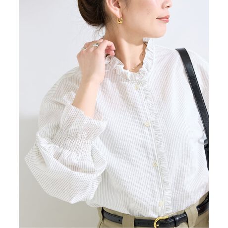 フリルがそこまで主張しない為甘すぎず、細ピッチのストライプ柄で上品で大人っぽい印象で着ていただけます。一枚で着映えするデザインながら、ジャケットやカーディガンのインナーとしても合わせやすく、オンオフ問わず着用できます。