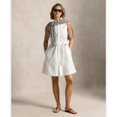 シグネチャーの中厚手のコットン オックスフォードを使用したノースリーブのドレス。Aラインのシルエットを形成するプリンセスラインと、ウエストを強調するセルフベルトが特徴。左胸にあしらった緻密なポニー刺繍でタイムレスなルックを完成・Aラインのシルエット / 膝上丈・ポインテッドカラー / ボタン付き前立て / シェルボタン・ノースリーブのシルエット / 左胸にシグネチャーのポニー刺繍・サイドシームポケット / バックヨーク / 前後にプリンセスライン・セルフベルト付き・モデル身長178cm、着用サイズ4 【素材】・本体:綿 100% 装飾部分を除く【生産国】ベトナム