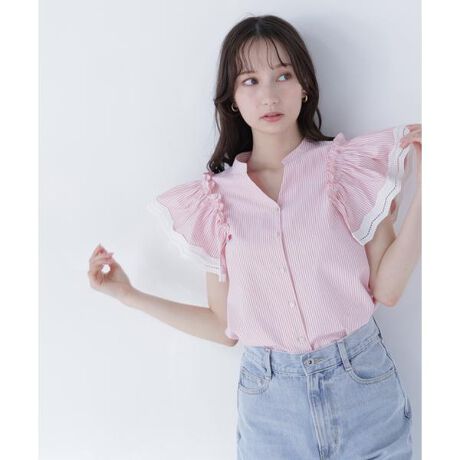 ストライプ柄にレーストリムを効かせた華やかなブラウス。前開きVネックで顔まわりをすっきり見せ、程よいフレアスリーブで軽やかな印象に見せてくれます。袖先のスカラップレースがアクセントになり、一枚で着映えるデザインです。<素材>ストライプシャツ生地を使用しています。<詳細>仕様・前ボタン裏地・なし透け感・なし / 光沢・なし / 伸縮性・なし生地の厚さ・普通※モデルの着用画像の場合、光の当たり具合により、実際の色味と異なって見えることがございます。色味は、商品単体の画像をご参照ください。