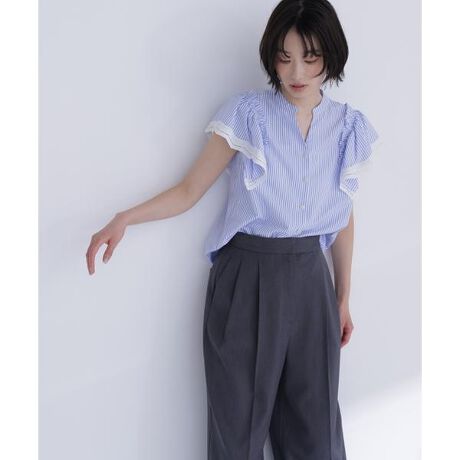 ストライプ柄にレーストリムを効かせた華やかなブラウス。前開きVネックで顔まわりをすっきり見せ、程よいフレアスリーブで軽やかな印象に見せてくれます。袖先のスカラップレースがアクセントになり、一枚で着映えるデザインです。<素材>ストライプシャツ生地を使用しています。<詳細>仕様・前ボタン裏地・なし透け感・なし / 光沢・なし / 伸縮性・なし生地の厚さ・普通※モデルの着用画像の場合、光の当たり具合により、実際の色味と異なって見えることがございます。色味は、商品単体の画像をご参照ください。