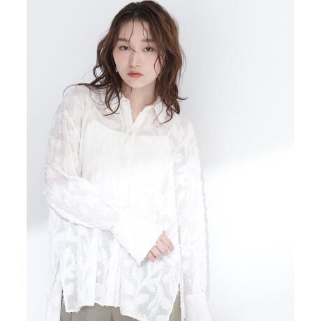 シンプルなシャツデザインで、前を閉めても開けても着られる便利なシアーシャツ。サイドは深いスリット入りで抜け感をプラス。ややフレアになったカフスがポイントで、カジュアルになりすぎず、女性らしく着ていただけます。<素材>透け感がありボタニカル柄が映えるシアー生地を使用しています。<詳細>仕様・前ボタン裏地・なし透け感・あり / 光沢・なし / 伸縮性・なし生地の厚さ・薄手※モデルの着用画像の場合、光の当たり具合により、実際の色味と異なって見えることがございます。色味は、商品単体の画像をご参照ください。