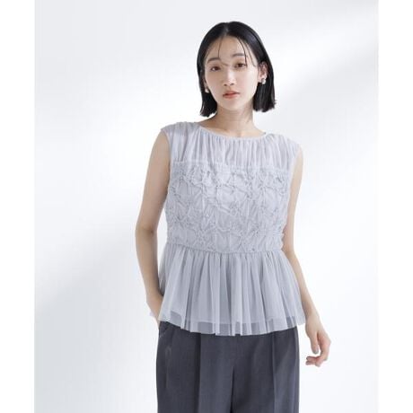 フロントにあしらったラメ糸スモッキング刺しゅうが華やかなペプラムブラウス。薄手の裏地付きでデコルテまわりの透け感を抑えています。ハイウエストで切り替えたギャザー入りペプラムラインで、今年らしいシルエットを演出。後ろウエストはシャーリング仕様でストレスフリーな着心地です。<素材>細かいチュール素材を使用しています。<詳細>仕様・後ろボタン裏地・あり透け感・ややあり / 光沢・なし / 伸縮性・なし生地の厚さ・薄手※モデルの着用画像の場合、光の当たり具合により、実際の色味と異なって見えることがございます。色味は、商品単体の画像をご参照ください。
