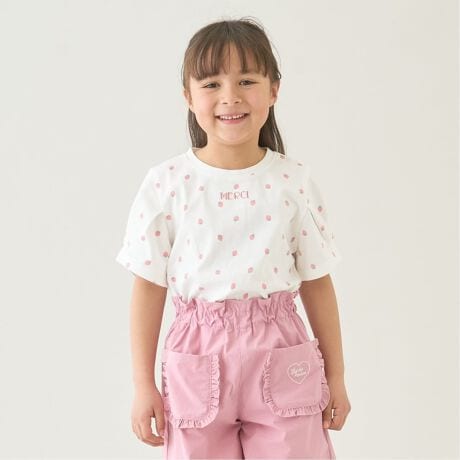 ・イチゴ、ハート、リボン、ドットの総柄プリントで元気な印象