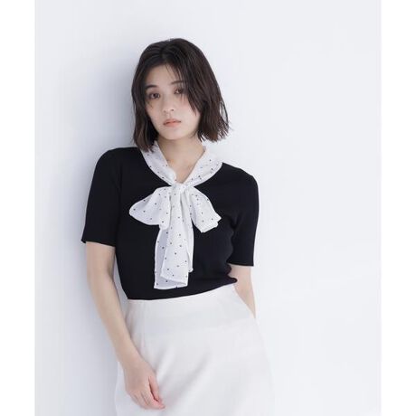 控えめなドット柄が華やかさを添えるフェミニンな雰囲気のニット。ボウタイリボンがアクセントになり、大人の可愛さと上品さを両立したデザイン。シンプルなボトムスやタイトスカートと合わせるだけで、オフィスからお出かけまで映えるキレイめコーディネートが完成します。<素材>ドライタッチの糸を使用しています。<詳細>仕様・開閉なし裏地・なし透け感・なし / 光沢・なし / 伸縮性・あり生地の厚さ・普通※モデルの着用画像の場合、光の当たり具合により、実際の色味と異なって見えることがございます。色味は、商品単体の画像をご参照ください。