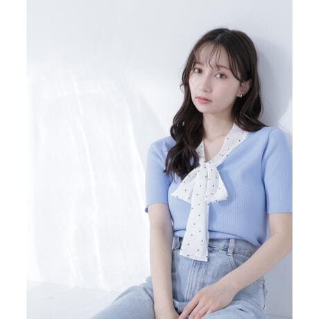 控えめなドット柄が華やかさを添えるフェミニンな雰囲気のニット。ボウタイリボンがアクセントになり、大人の可愛さと上品さを両立したデザイン。シンプルなボトムスやタイトスカートと合わせるだけで、オフィスからお出かけまで映えるキレイめコーディネートが完成します。<素材>ドライタッチの糸を使用しています。<詳細>仕様・開閉なし裏地・なし透け感・なし / 光沢・なし / 伸縮性・あり生地の厚さ・普通※モデルの着用画像の場合、光の当たり具合により、実際の色味と異なって見えることがございます。色味は、商品単体の画像をご参照ください。