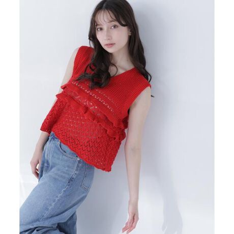 昨年人気だったアイテムが新色で再登場!複数の透かし編みをミックスしたカジュアルフェミニンなフリルニット。コンパクトな丈感なのでボトムスと合わせやすいです。デニムパンツを合わせると夏にぴったりなカジュアルスタイルが完成します。<素材>軽やかなニット素材を使用しています。<詳細>仕様・開閉なし裏地・なし透け感・ややあり / 光沢・なし / 伸縮性・あり生地の厚さ・普通※キャメルのカラーは糸の特性上、赤とブラウンが混ざったようなニュアンスのあるカラーです。※モデルの着用画像の場合、光の当たり具合により、実際の色味と異なって見えることがございます。色味は、商品単体の画像をご参照ください。