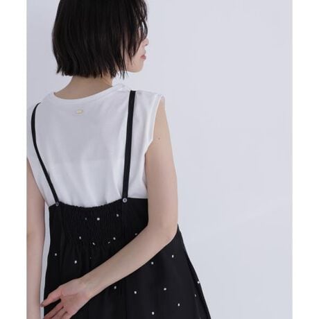 後ろ襟ぐりのメタルパーツが上品なアクセントのノースリーブカットソー。前はシンプルなデザインで、洗練された印象に見せてくれます。すっきりとしたシルエットでパンツにもスカートにも合わせやすく、一枚でさらりと着るのはもちろん、ジャケットやカーディガンのインナーとしても活躍。オンオフ問わず着回せます。<素材>キレイめな印象のプレーティング天竺を使用しています。<詳細>仕様・開閉なし裏地・なし透け感・ややあり / 光沢・なし / 伸縮性・あり生地の厚さ・普通※モデルの着用画像の場合、光の当たり具合により、実際の色味と異なって見えることがございます。色味は、商品単体の画像をご参照ください。