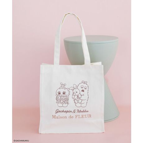うさぎを抱えたガチャピン・ムックの姿を繊細な刺繍で表現したトートバッグ。
