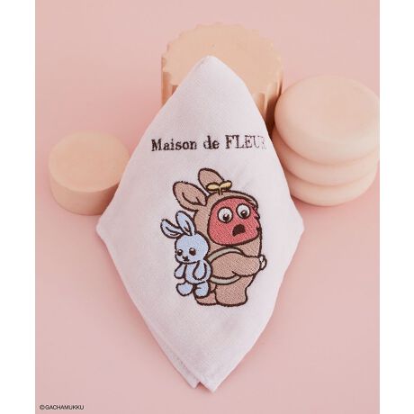 うさぎの着ぐるみ姿が愛らしいムックをパステルカラーの刺繍で表現したタオルハンカチ。
