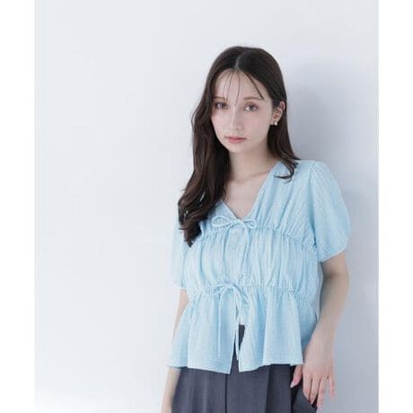 ポコポコとした凹凸感のある素材を使用した、ブラウスライクなカットソープルオーバー。カットソー素材とゴム仕様でリラクシーな着心地です。フロントのダブルリボンがポイントで、アウターを羽織った時も華やかに見せてくれます。<素材>ポコポコとした凹凸感のあるシュリンクカットソー素材を使用しています。<詳細>仕様・開閉なし裏地・なし透け感・ややあり / 光沢・なし / 伸縮性・あり生地の厚さ・薄手※モデルの着用画像の場合、光の当たり具合により、実際の色味と異なって見えることがございます。色味は、商品単体の画像をご参照ください。