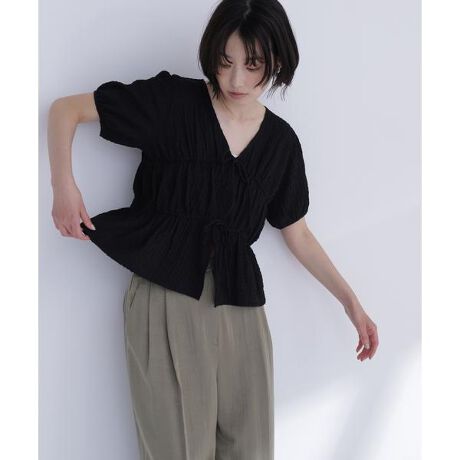 ポコポコとした凹凸感のある素材を使用した、ブラウスライクなカットソープルオーバー。カットソー素材とゴム仕様でリラクシーな着心地です。フロントのダブルリボンがポイントで、アウターを羽織った時も華やかに見せてくれます。<素材>ポコポコとした凹凸感のあるシュリンクカットソー素材を使用しています。<詳細>仕様・開閉なし裏地・なし透け感・ややあり / 光沢・なし / 伸縮性・あり生地の厚さ・薄手※モデルの着用画像の場合、光の当たり具合により、実際の色味と異なって見えることがございます。色味は、商品単体の画像をご参照ください。